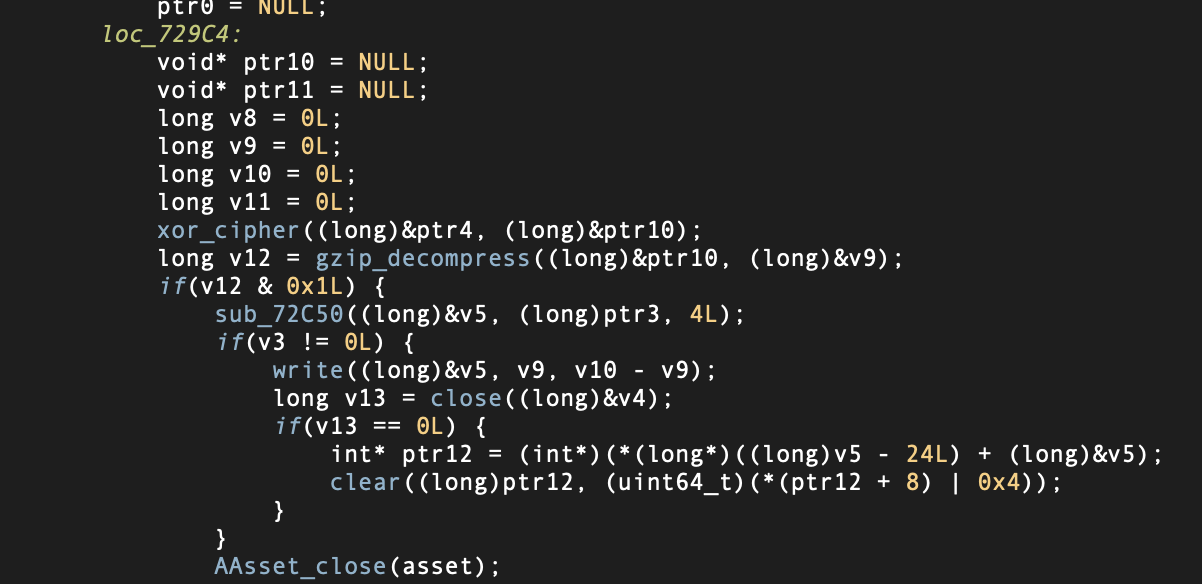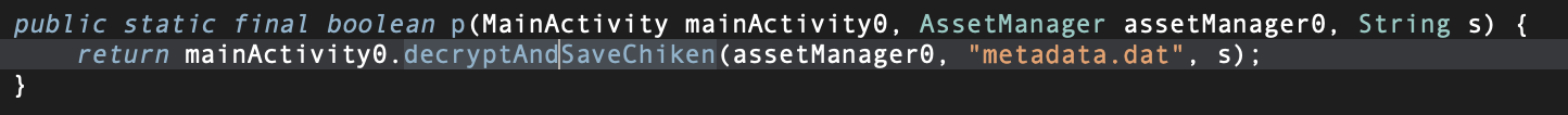 This library, at runtime, accesses and decrypts an encrypted asset named metadata.dat (Figure 9).