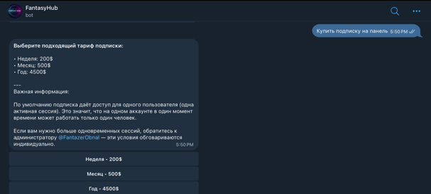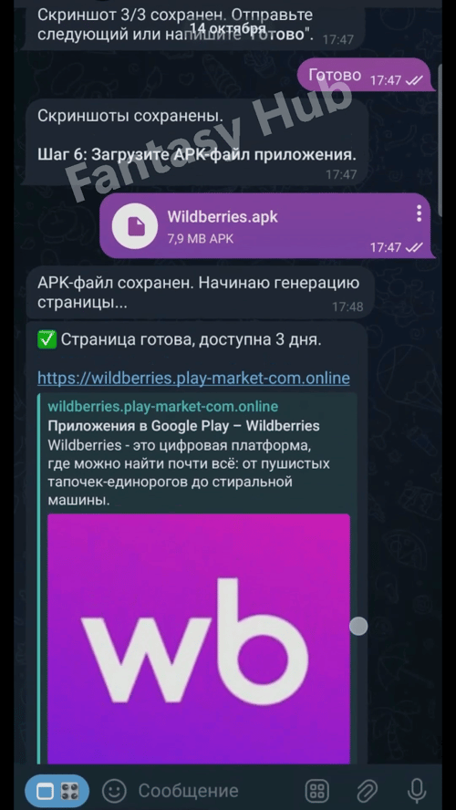 Official ads enumerate features and direct buyers to a Telegram bot that manages paid subscriptions and builder access (Figures 4–5). The bot’s “Dropper” option lets buyers upload any APK and returns a version with the Fantasy Hub dropper appended.