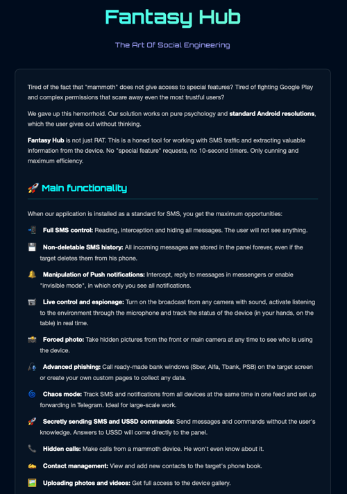 Operators based in Russia advertise Fantasy Hub as an Android RAT offered via a MaaS model (Figure 1).