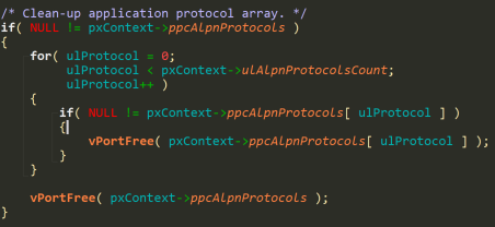 Which means an uninitialized pointer (ppcAlpnProtocols[1]) will be free’d.