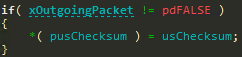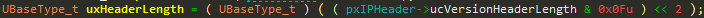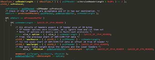 If the Rx packet had IP options, we know that the code had already removed them, but that it didn’t adjust the xIPHeader->ucVersionHeaderLength field accordingly.