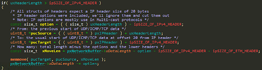 The code doesn’t handle IP Options at all and simply removes them from the packet by using memmove and truncating the xDataLength field of the network buffer.