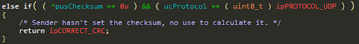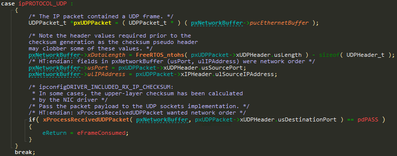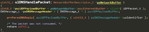 The first bug is at the prvProcessIPPacket function, whilst dispatching a UDP packet: