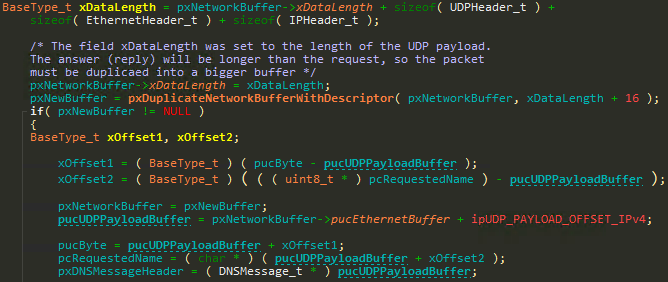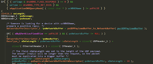 prvTreatNBNS, just like prvParseDNSReply, doesn’t check if xDataLength is large enough to contain the parsed NBNS packet, Thus permitting an attacker to read data out of bounds.