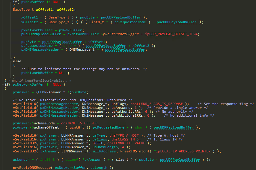 As we can see, xOffset1 is used to calculate the offset of the end of the DNS packet, where we want to insert our response. We later use it to build the LLMNR answer using pxAnswer.