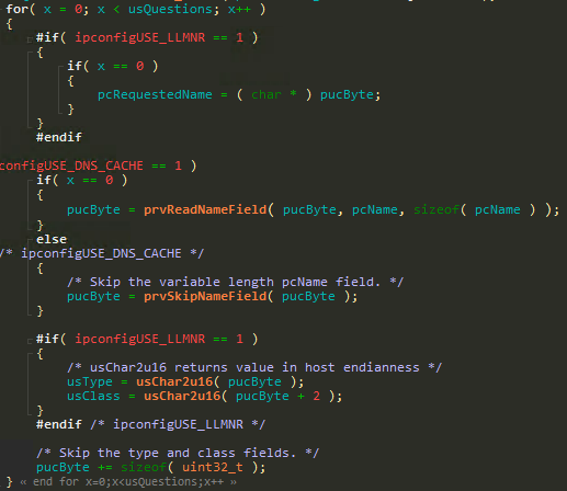 The next bug is at prvParseDNSReply, whilst parsing a DNSLLMNR request.
