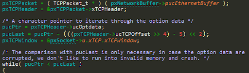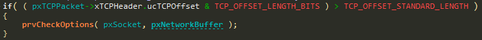 The code doesn’t validate that the packet buffer is large enough to contain the TCP options (pxNetworkBuffer->xDataLength):
