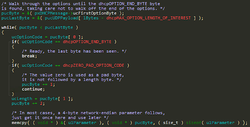 Also, whilst walking the DHCP option fields, length checks aren’t done correctly for the DHCP options: