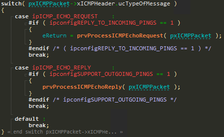 prvProcessICMPPacket doesn’t validate that the received frame is large enough to be an ICMP packet, and can access fields from this packet out of bounds: