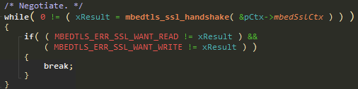 This flow is very problematic, as SOCKETS_Connect might have failed because the TLS handshake failed, and now we are using the same mbedTLS context (pCtx->mbedSslCtx) for reading data (mbedtls_ssl_read).
