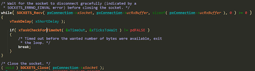 Back to prvSetupConnection, we can see that if SOCKETS_Connect fails, prvGracefulSocketClose is called.