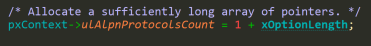 The problem is that the ppcAlpnProtocols pointer array is not cleaned up (memset to 0) after allocation, which means it will contain data from previous allocations on the heap.