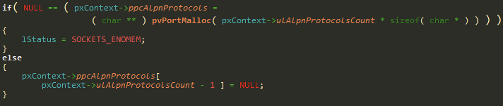 An array of pointers is allocated at the pxContext->ppcAlpnProtocols field, each of these pointers will point to a single protocol name: