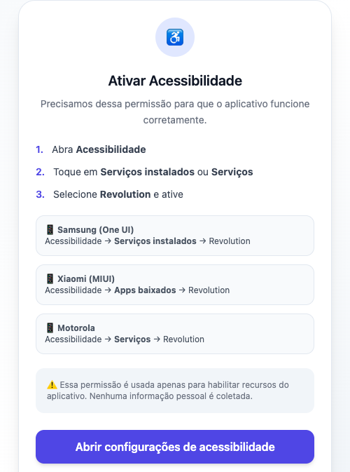 Figure 2. Social engineering onboarding screen requesting the victim to enable the “Revolution” accessibility service, with manufacturer-specific instructions