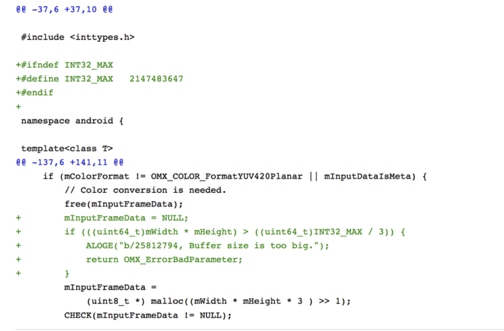 As promised, Google updated the advisory within 48 hours with links to the AOSP commits that fixed the issues. It’s Interesting that several issues correspond to commits first released to the public in January. Unfortunately, this form of partial disclosure tends to give attackers that monitor code pushes a head start — especially when targeting 3rd party Android devices. On the bright side, that means up-to-date Nexus users were protected for an extra month before the official public disclosure. Let’s take a closer look at the relevant code changes for each issue.