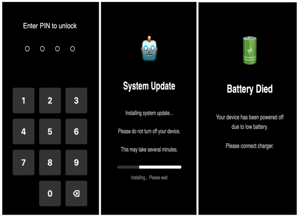 - System Update / Battery Overlay: A non‑interactive overlay designed to conceal ongoing background actions (Fig. 5).